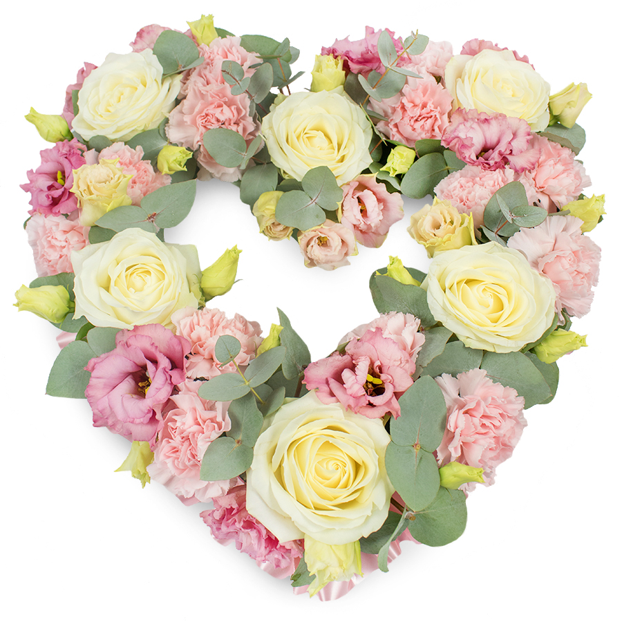 Express your heartfelt sentiments with the Serene Heart bouquet. This graceful arrangement combines white roses, pink carnations, pink lisianthus, and soothing Eucalyptus leaves, artfully arranged to honor and remember your loved one.